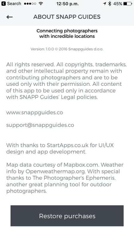 - Generally with in-app purchases, you’ll need to choose “ Restore purchase ” to let the app know about the new in-app purchase products that you’re now entitled to use. Open SNAPP Guides and choose About from the side bar: