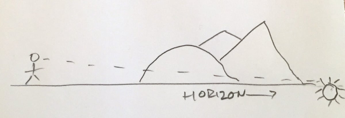 If you can’t see the sun until it has risen above an obstacle, such as a mountain or hill, then you will only see the sun after the standard time of sunrise and the direction will not be the same. In the northern hemisphere, the sun will track to the south after sunrise and vice versa in the southern hemisphere. In the tropics, the direction will depend on the exact location, time of year and time since sunrise.