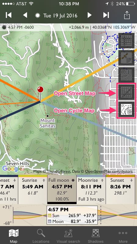 Finally, TPE also looks up elevation above sea level for both primary (red) and secondary (grey) map marker locations. Elevation above sea level affects the actual time of rise/set and apparent position of the sun/moon in the sky, due to atmospheric refraction. If there’s no internet connection, TPE will assume that the location is at sea level (which is what very many sunrise/set calculators do all the time), and the data will be very slightly less accurate as a result.