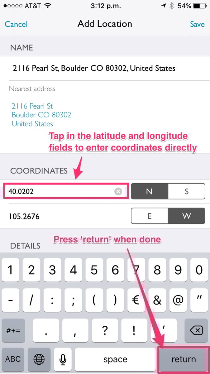 You can specify coordinates for a location directly within the app as follows: