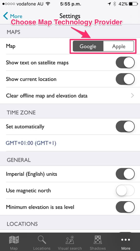 You can switch from Google to Apple for the base map technology provider in the app’s Settings screen:
