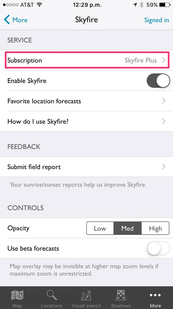 If you’re already signed in and you want to view the details of your current trial or subscription (e.g. expiry date, upgrade or renewal options), from the Skyfire page choose “ Subscription ”:
