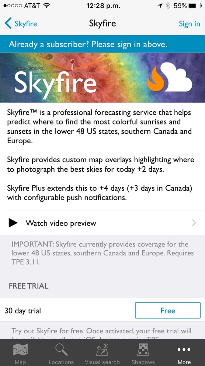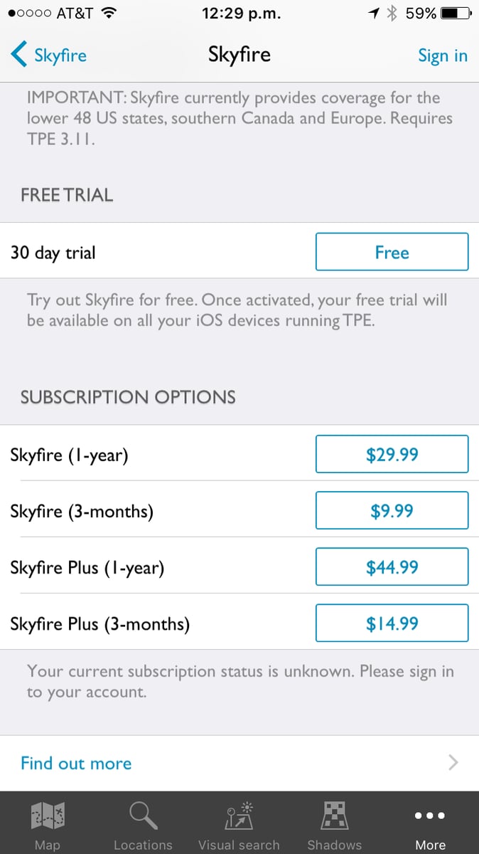 By default, if you haven’t previously used Skyfire, you’ll be shown the trial/purchase page where you can either start a free 30-day trial or sign up for a subscription: