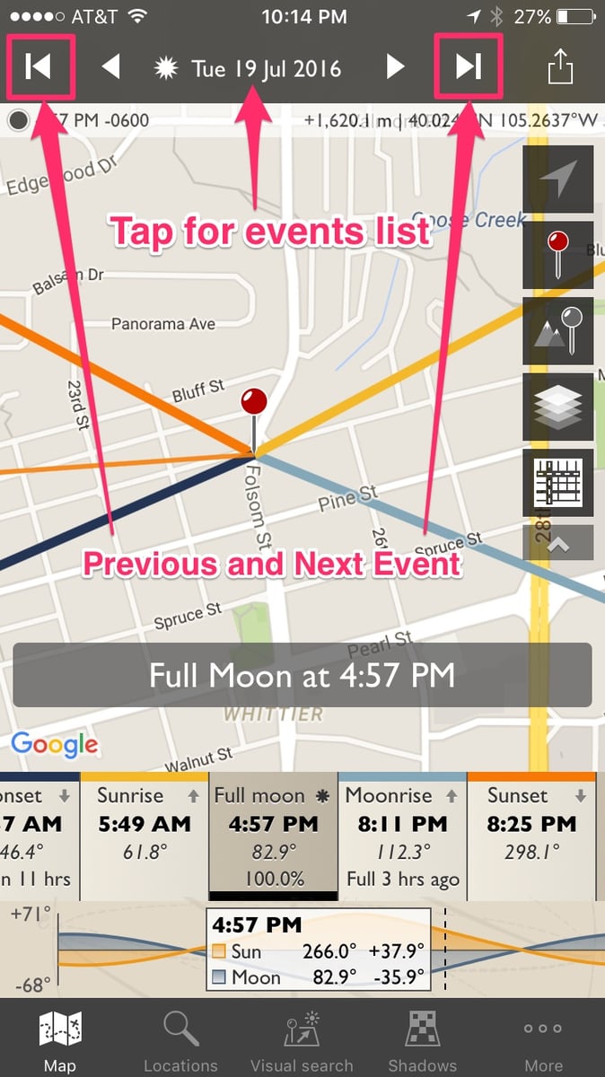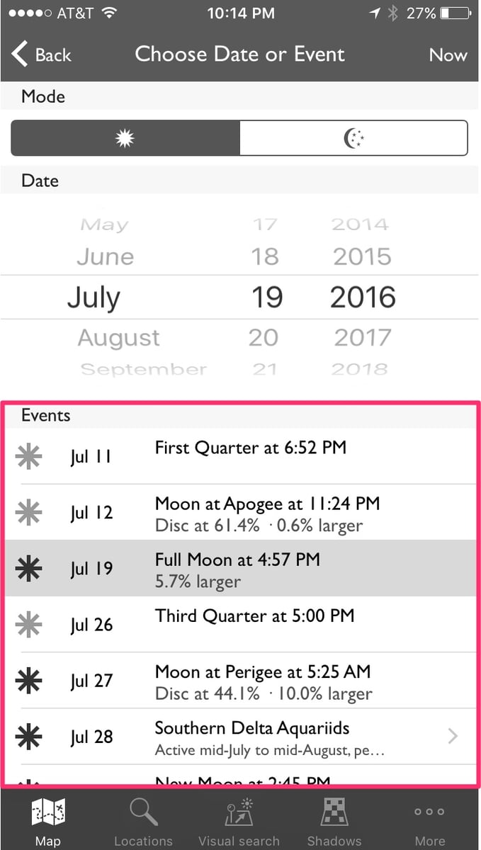 You can move from previous to next event using the controls at the top of the screen (shown below). The events list includes moon phases and other events such as lunar apogee and perigee.