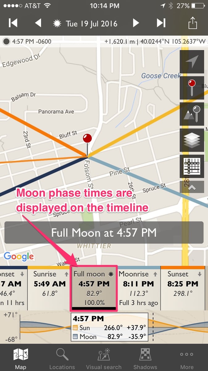 All moon phase events are displayed on the timeline beneath the map. These events include New Moon, 1st Quarter, Full Moon, 3rd Quarter: